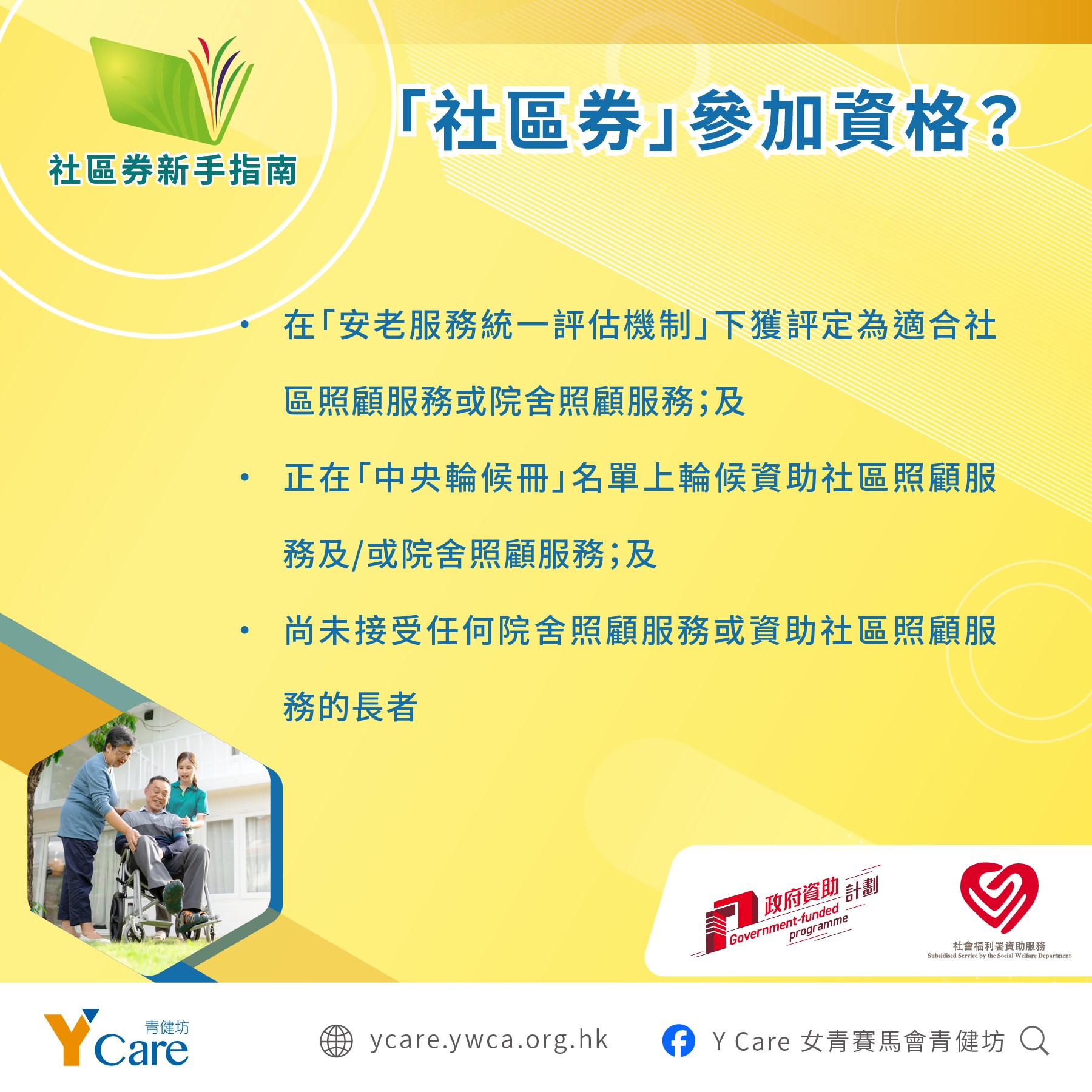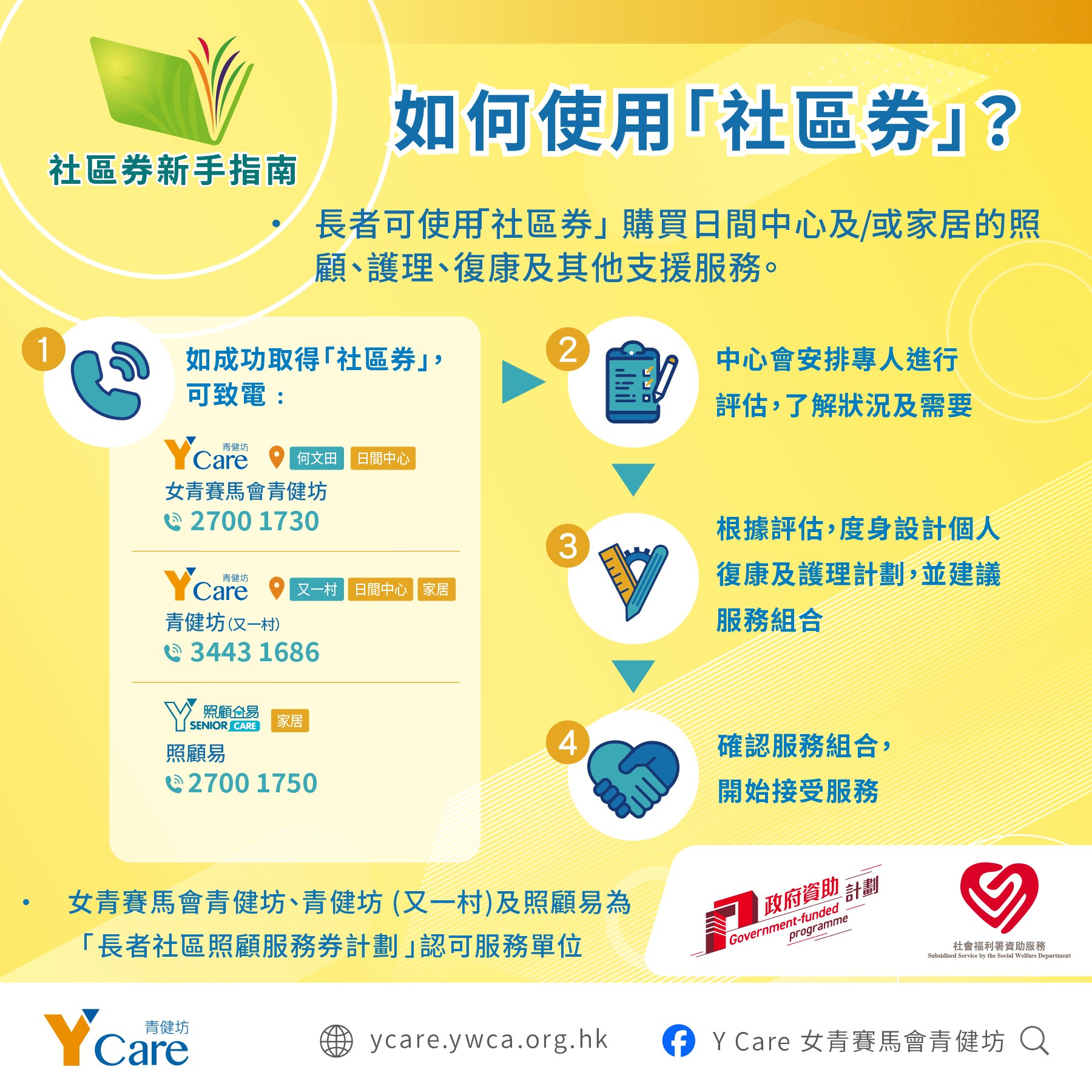 取得「社區券」後,亦可致電認可服務單位查詢服務組合及評估安排,為長者設計合適的個人復康及護理計劃。